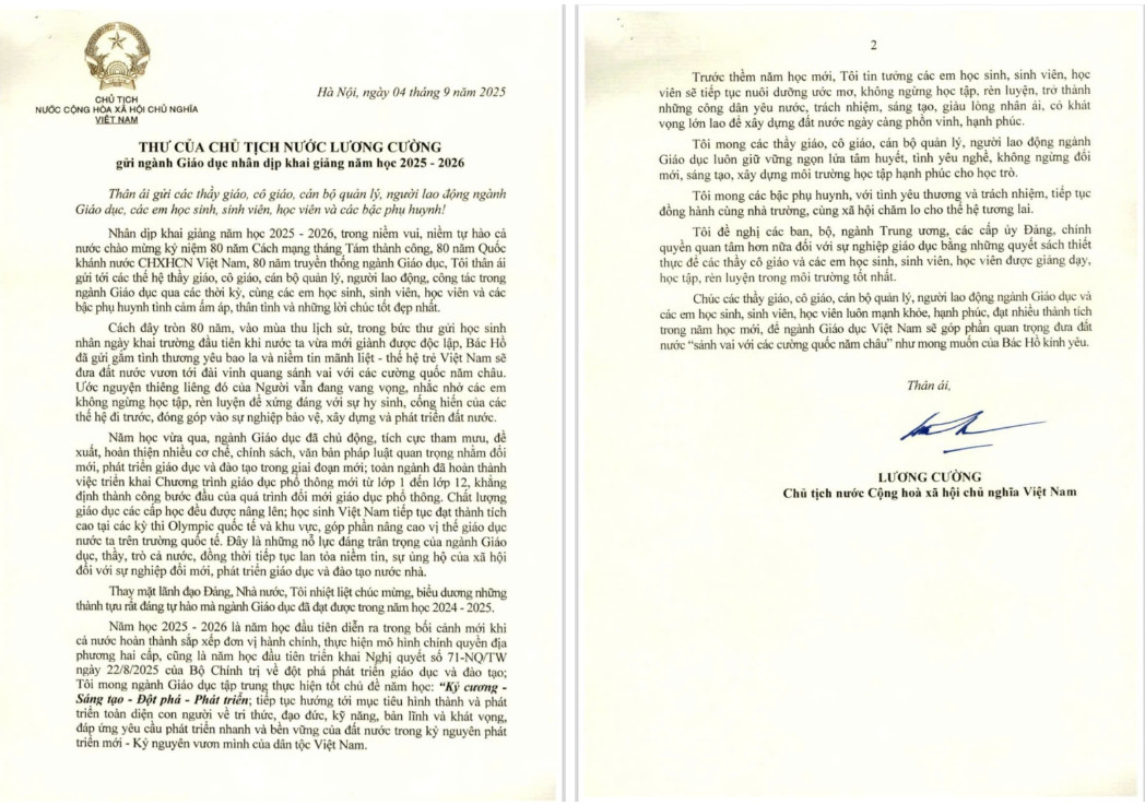 Thư của Chủ tịch nước Lương Cường gửi ngành Giáo dục nhân dịp khai giảng năm học 2025-2026